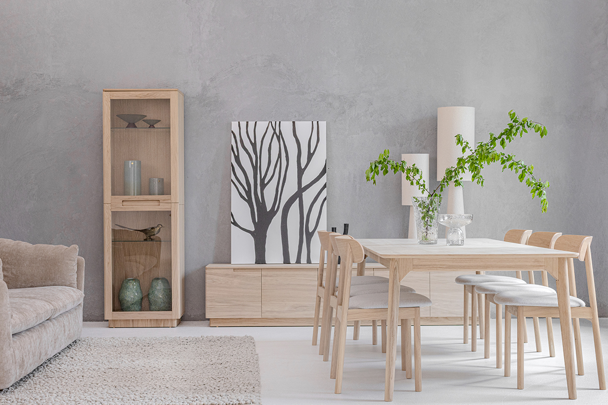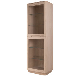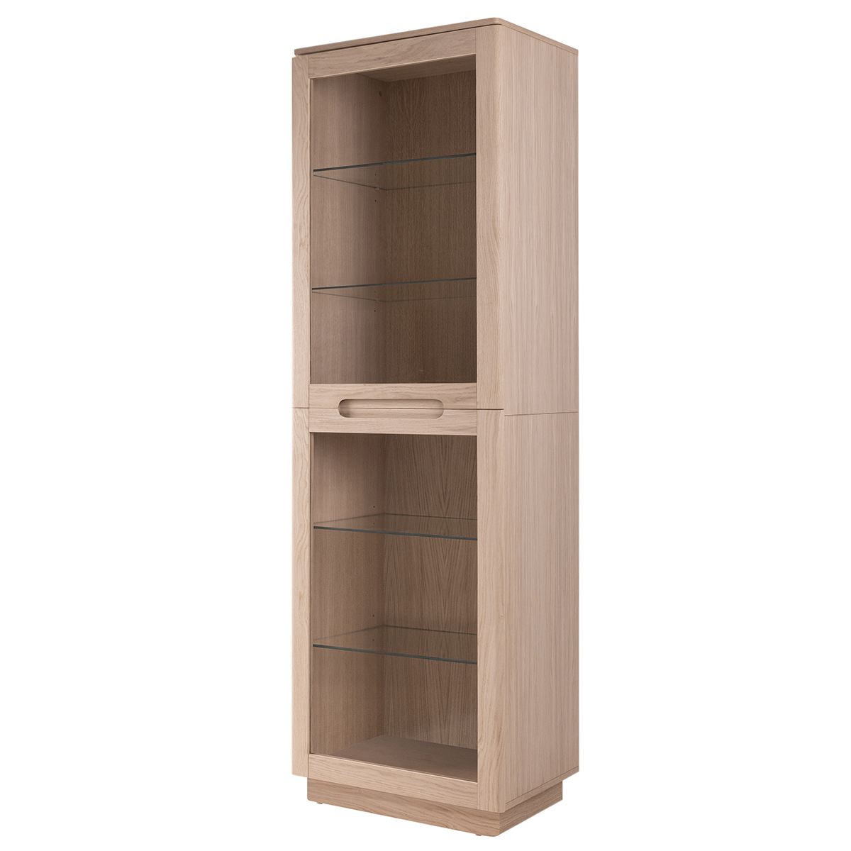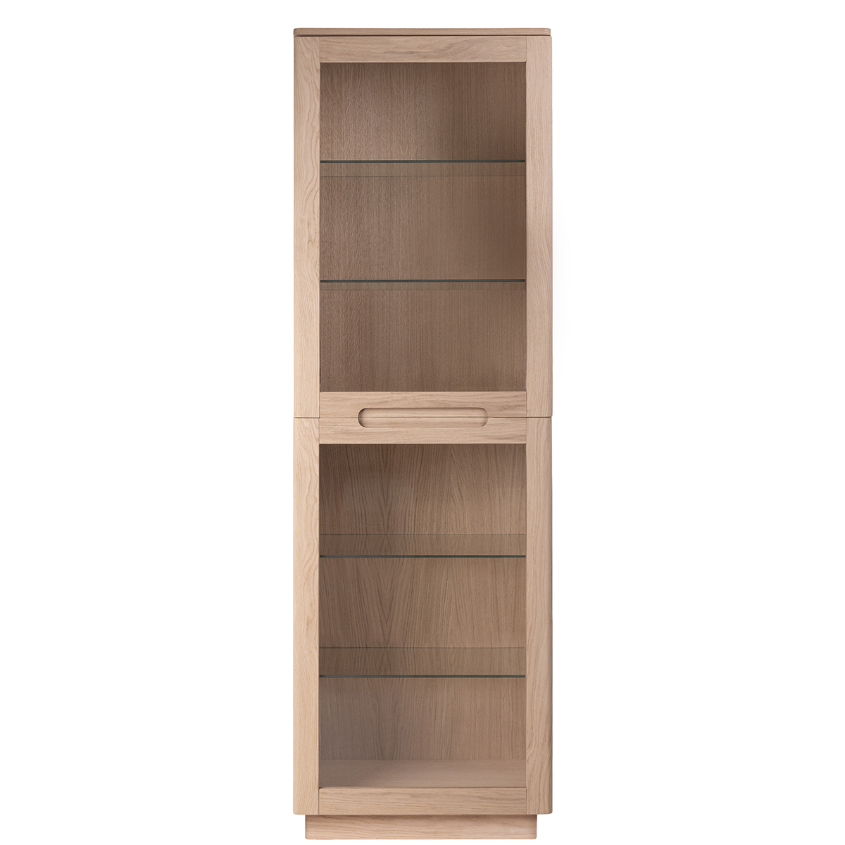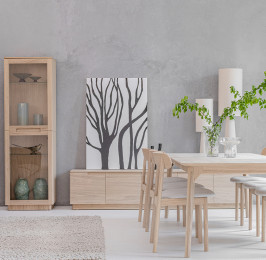 SCANDI vitrina su dviem stiklinėmis durimis įkūnija skandinaviško dizaino paprastumą ir eleganciją. Pagaminta iš ąžuolo lukšto, šviesaus Nordic white oak atspalvio, ji harmoningai dera tiek moderniuose, tiek klasikinio stiliaus interjeruose.